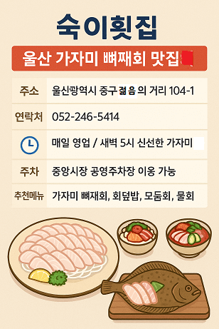 씹는 맛이 살아있는 가자미 뼈째회, 울산에서만 즐길 수 있는 별미를 찾는다면 울산 젊음의거리 숙이횟집이 정답입니다. 매일 새벽 신선한 가자미를 직접 공수하여 제공되는 6시내고향 가자미회는 그 맛과 식감에서 차별화를 자랑합니다.